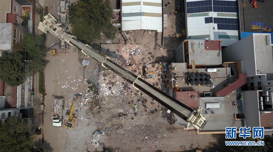 9月25日的航拍照片显示,救援人员在墨西哥首都墨西哥城的一处地震废墟中搜寻。墨西哥全国民防机构负责人说,截至周一墨西哥地震已造成324人死亡。新华社发(保罗·孔特雷拉斯)