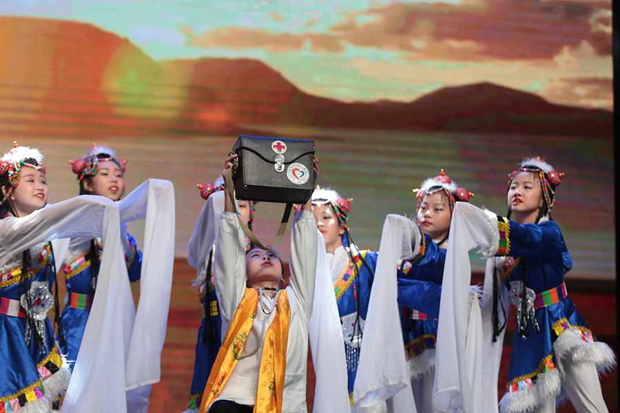 音乐舞蹈剧《曼巴卓玛》。在藏语里,曼巴是医生,卓玛是天使,曼巴卓玛就是悬壶济世的白衣天使,孩子们以此对医务志愿者们的无私大爱、医者仁心的付出表示感谢。