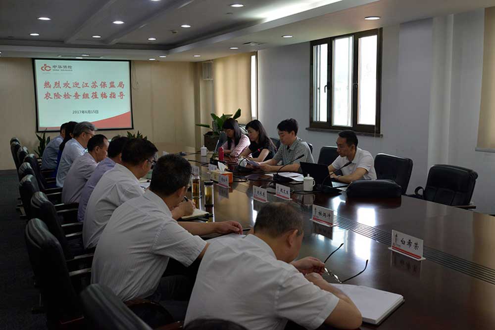 2017年6月15日,江苏保监局财产保险监管处王雷处长率员赴中华联合财产保险江苏分公司,开展农业保险承保理赔档案真实性、完整性专项检查,并对农业保险工作进行调研。