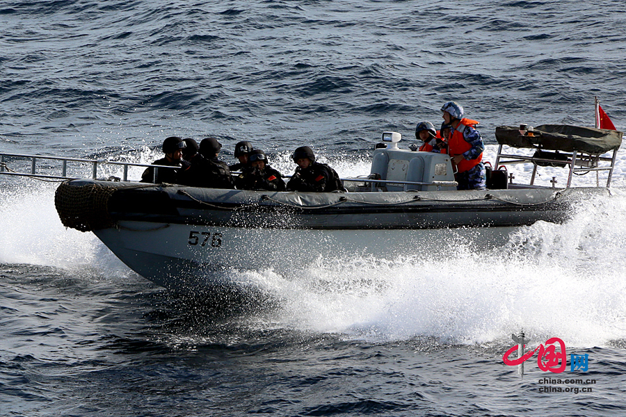 中俄海军舰艇编队进行了联合反海盗演练。中国网 鲁楠摄