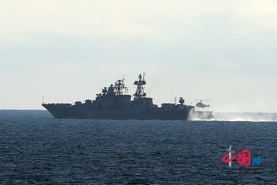 俄海军卡-27直升机在“特里布茨海军上将”号反潜舰上进行起降训练。中国网 鲁楠摄