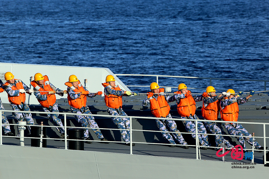 中方编队进行综合横向补给。中国网 鲁楠摄