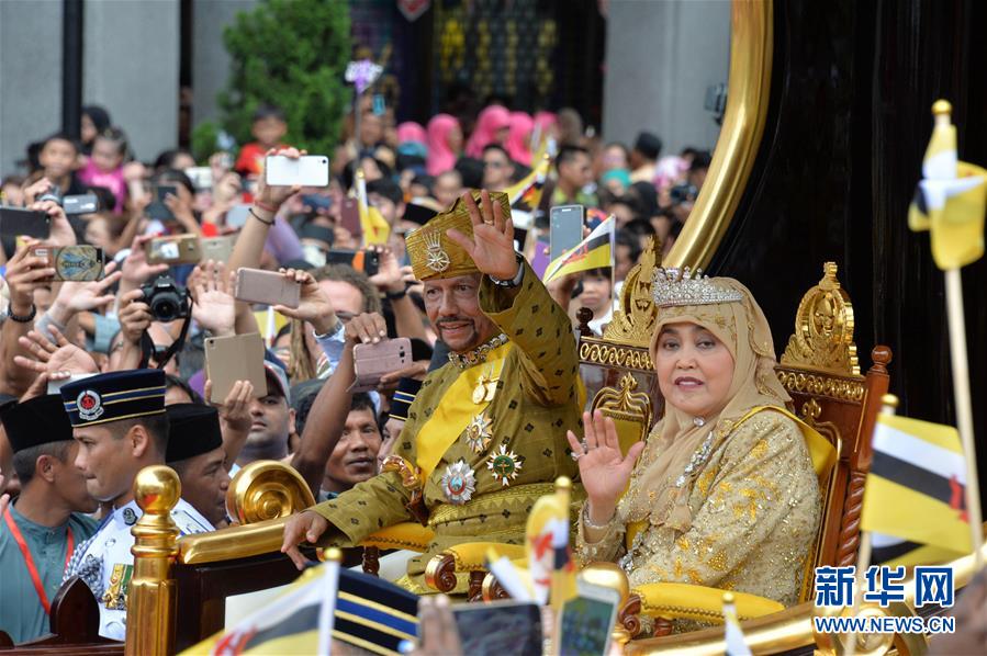 10月5日,在文莱首都斯里巴加湾市,文莱苏丹哈桑纳尔·博尔基亚(前右二)向民众挥手致意。文莱5日举行大规模庆典,庆祝苏丹哈桑纳尔·博尔基亚登基50周年。新华社发(杰弗里·黄 摄)