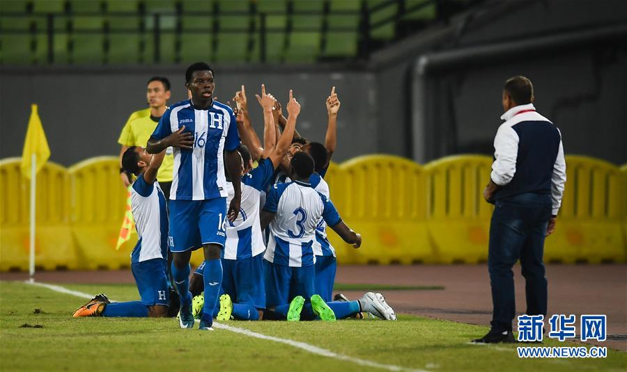 10月7日,洪都拉斯队球员在比赛中庆祝进球。当日,在江苏省江阴市举行的2017年中国足协中国之队国际足球赛中,中国U22国家男子足球队以2比2战平洪都拉斯U22国家男子足球队。新华社记者李响 摄