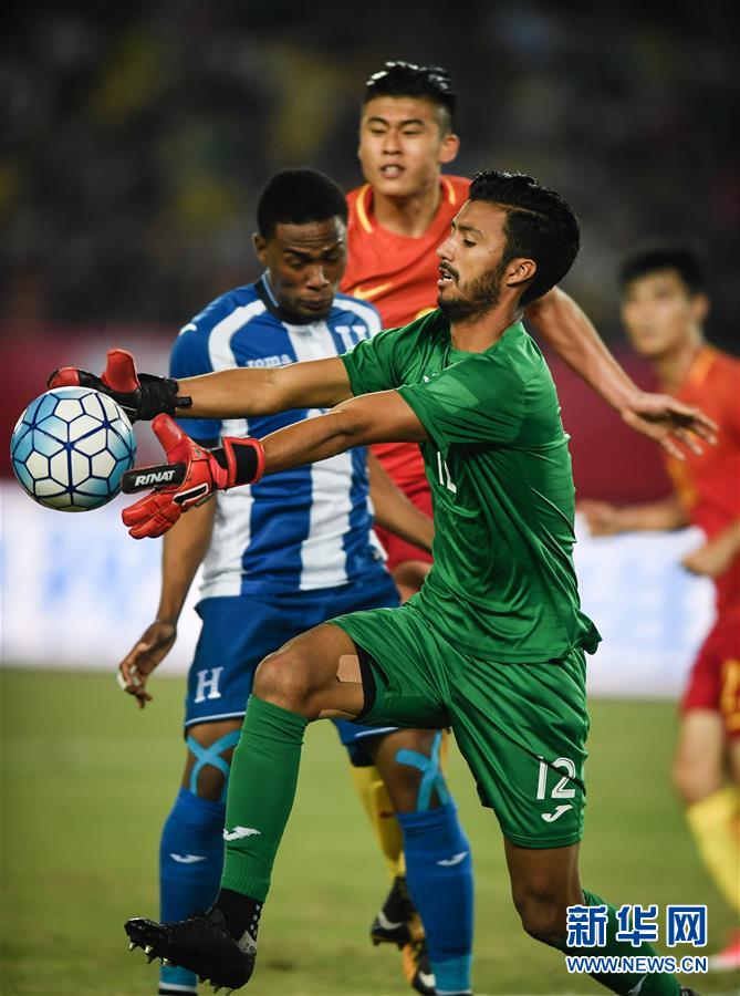 10月7日,洪都拉斯队守门员罗伯托·洛佩斯(前)在比赛中扑救。当日,在江苏省江阴市举行的2017年中国足协中国之队国际足球赛中,中国U22国家男子足球队以2比2战平洪都拉斯U22国家男子足球队。新华社记者李响 摄