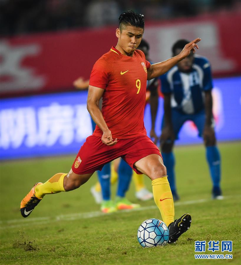 10月7日,中国队球员张玉宁在比赛中罚中点球。当日,在江苏省江阴市举行的2017年中国足协中国之队国际足球赛中,中国U22国家男子足球队以2比2战平洪都拉斯U22国家男子足球队。新华社记者李响 摄