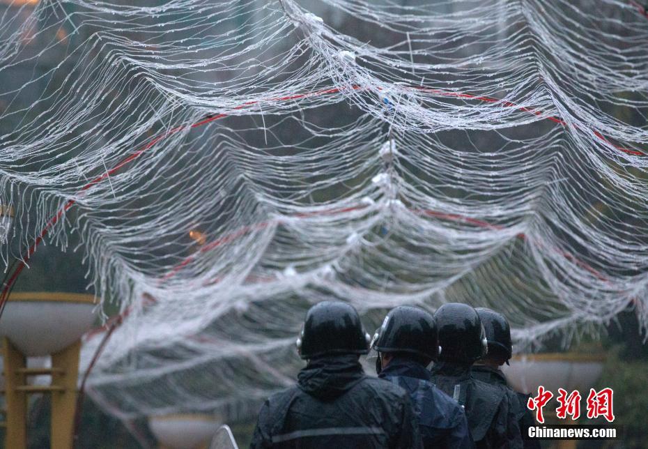 北京一小区的保安在雨中巡楼。 中新社记者 刘关关 摄