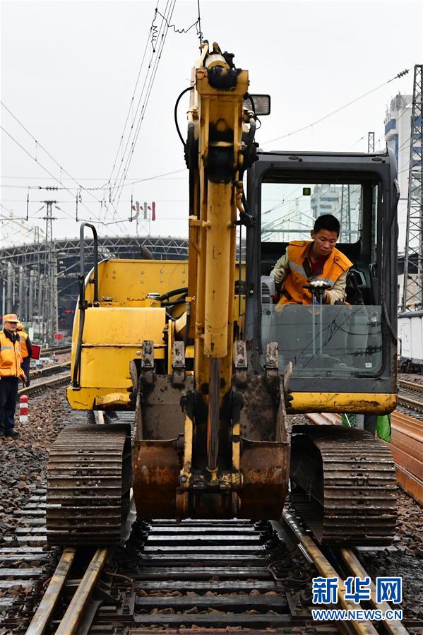 10月10日,在郑州火车站,机械在钢轨上行驶。