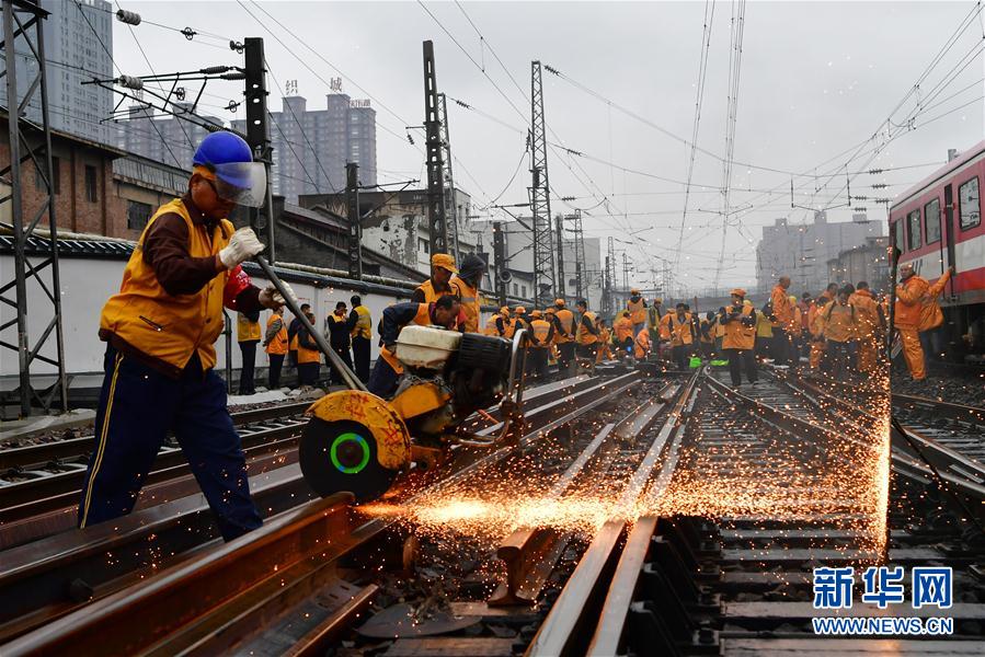 10月10日,在郑州火车站,工人在切割钢轨。