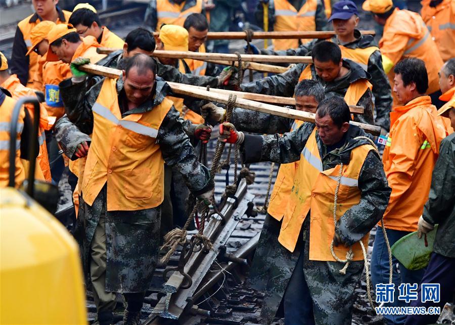 10月10日,在郑州火车站,工人在抬运钢轨。