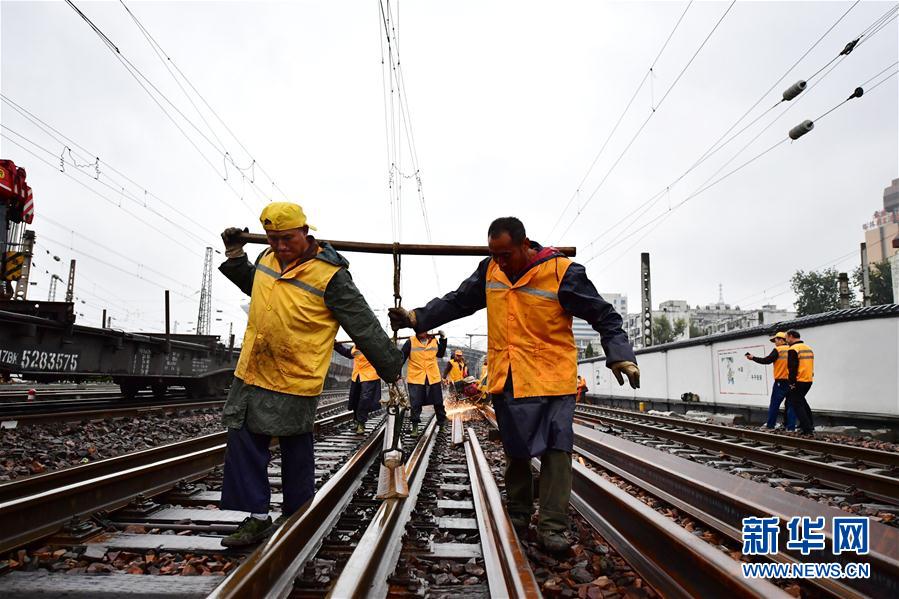 10月10日,在郑州火车站,工人在抬运钢轨。