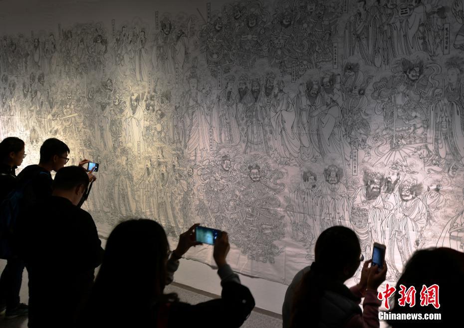 10月17日,“姚淑龙复原临摹毗卢寺壁画展”亮相河北师范大学博物馆。石家庄画家姚淑龙历时十载,最终依原貌、原比例绘制完成全堂六壁十彩壁画摹本,使壁画再现原有风采。中新社记者 翟羽佳 摄