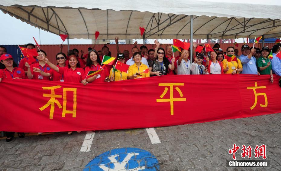 中资企业员工、华侨华人等挥动中刚两国国旗,送别中国海军和平方舟医院船。江山 摄