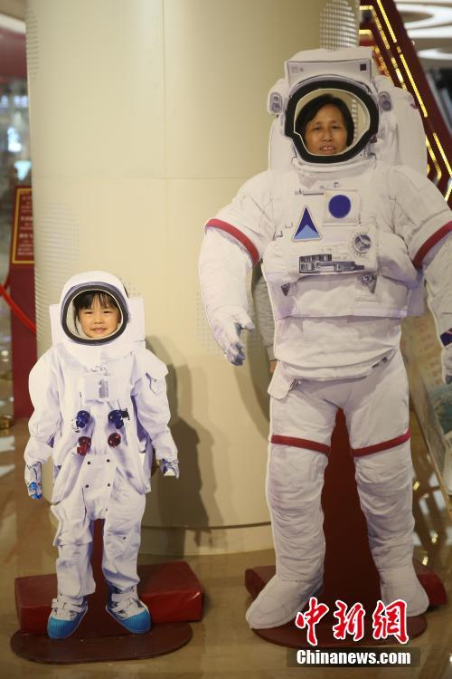 10月18日晚,市民和孩子一起拍摄“航天员”照片。近日,“中国航天主题特展”亮相南京,吸引了众多家长带着孩子一起前来。中新社记者 泱波摄