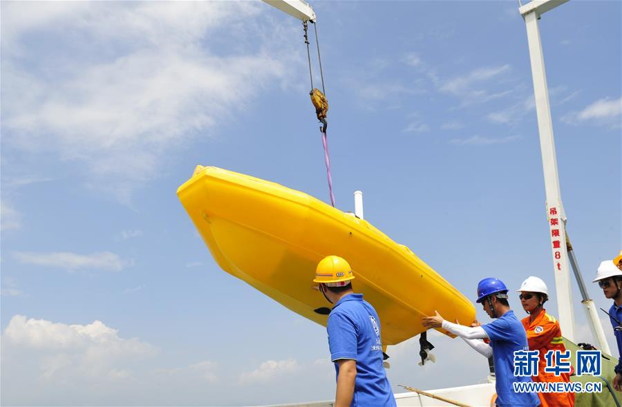我国首次利用无人艇进行海岸带综合地质调查调查队员将“精海虹号”无人艇施放到海面(10月22日摄)。中国地质调查局正在开展的我国重点海岸带综合地质调查中,广州海洋地质调查局与上海大学合作,首次利用无人艇在海南三亚湾海岸带进行综合地质调查。新华社记者张建松 摄