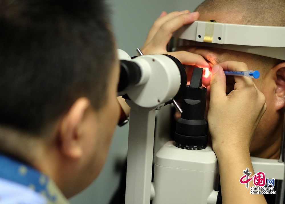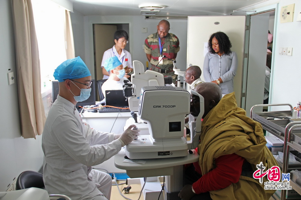 9月21日,在中国海军和平方舟医院船上,眼科门诊为塞拉利昂民众进行眼睛检查。(右一医生为吴晋晖)当地年龄87岁的老人阿尔吉斯(ALHGIS)是弗里敦50公里外的村民,双眼几乎失明,由儿子陪同来做白内障手术,术后视力恢复到1.0。当看清吴晋晖这个主治医生时,老人激动的举起大拇指,表达感激……当一个个白内障术后患者揭开纱布时,惊喜地说“VERY CLEAR(非常清楚)”,而此时此刻,吴晋晖和他的同事会感到无比幸福。江山摄