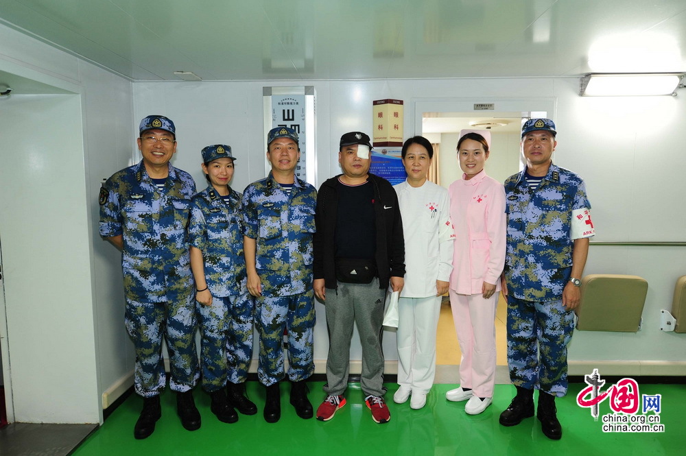 8月17日清晨,医院船正与执行第26批护航任务的黄冈舰联合为中国籍散货船“腾达”号实施伴随护航,突然接到商船轮机长张春燕眼外伤发出求救信号。作为眼科医生,吴晋晖接指挥所通知后第一时间赶到驾驶室进行了电话问诊。得知他保养装备时角磨机打磨的铁锈飞入眼睛,现左眼红肿,情况严重,吴晋晖随海上医院院长孙涛及队员易岚立即乘小艇将张春燕接到医院船,并成功取出左眼异物使其避免了失明危险。江山摄