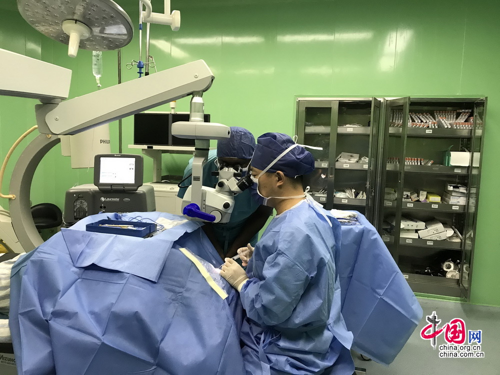 10月3日,在和平方舟手术室,眼科主治医师吴晋晖(右)为加蓬45岁的邦朱姆布(BANDJOUMBOU)进行白内障手术,并带教加眼科军医ALICS。