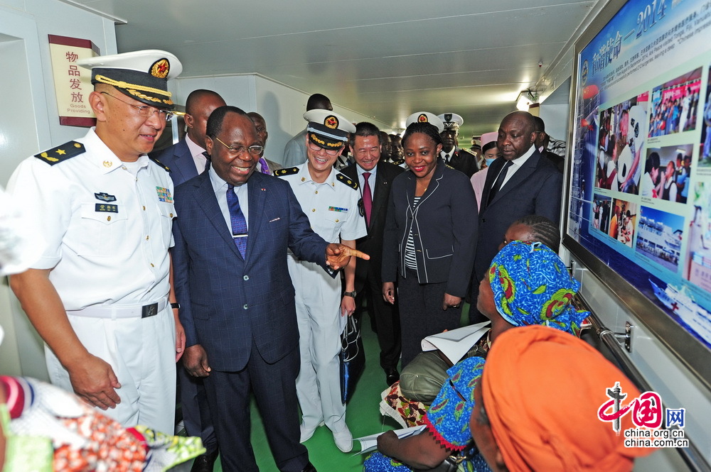 10月11日,在中国海军和平方舟医院船,刚果(布)总理穆安巴登船参观,盛赞医院船为刚果(布)民众提供的免费诊疗服务,称和平方舟不仅名字里强调“和平”两字,更以实际行动向世界传递大爱与和平。江山摄