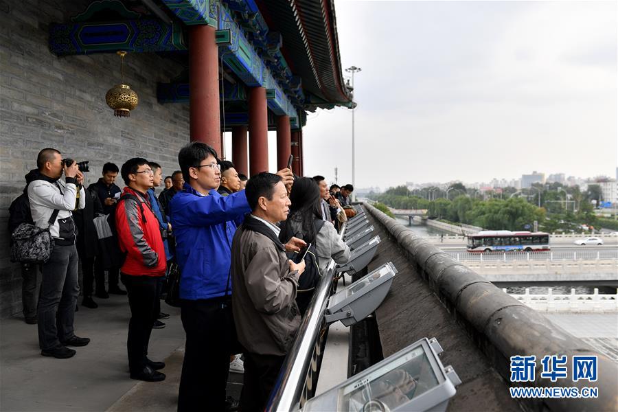10月12日,参与中共十九大新闻报道的记者参加“古都文化魅力中轴线”的采访活动。这是韩国《中央日报》驻北京总局特派记者申庚振(前右二)、柬埔寨《高棉日报》驻北京记者张春河(前右一)等在永定门城楼上参观。新华社记者李鑫 摄