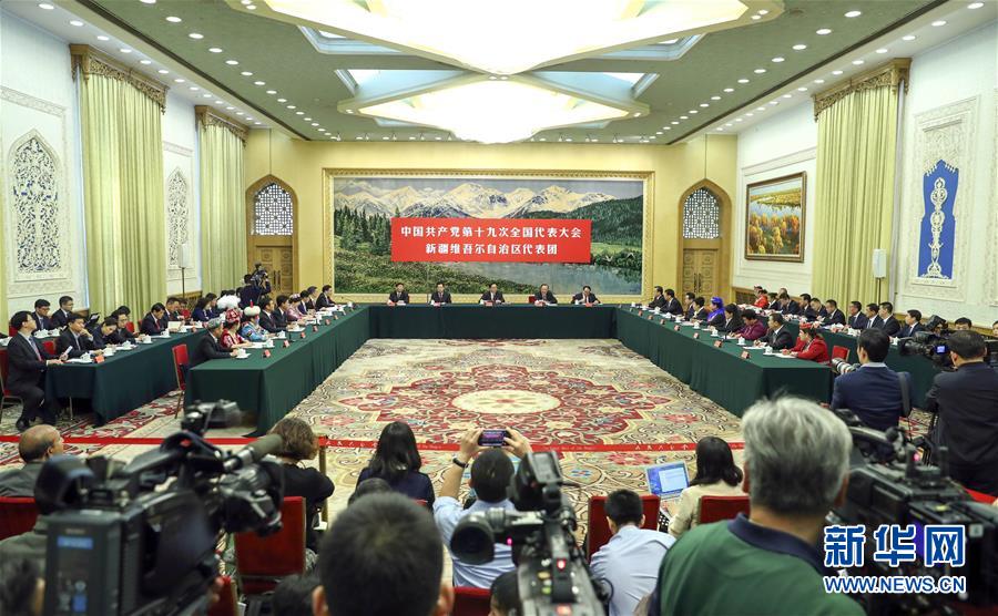 10月19日,十九大部分代表团讨论向中外记者开放。这是记者在采访。新华社记者 谢环驰 摄