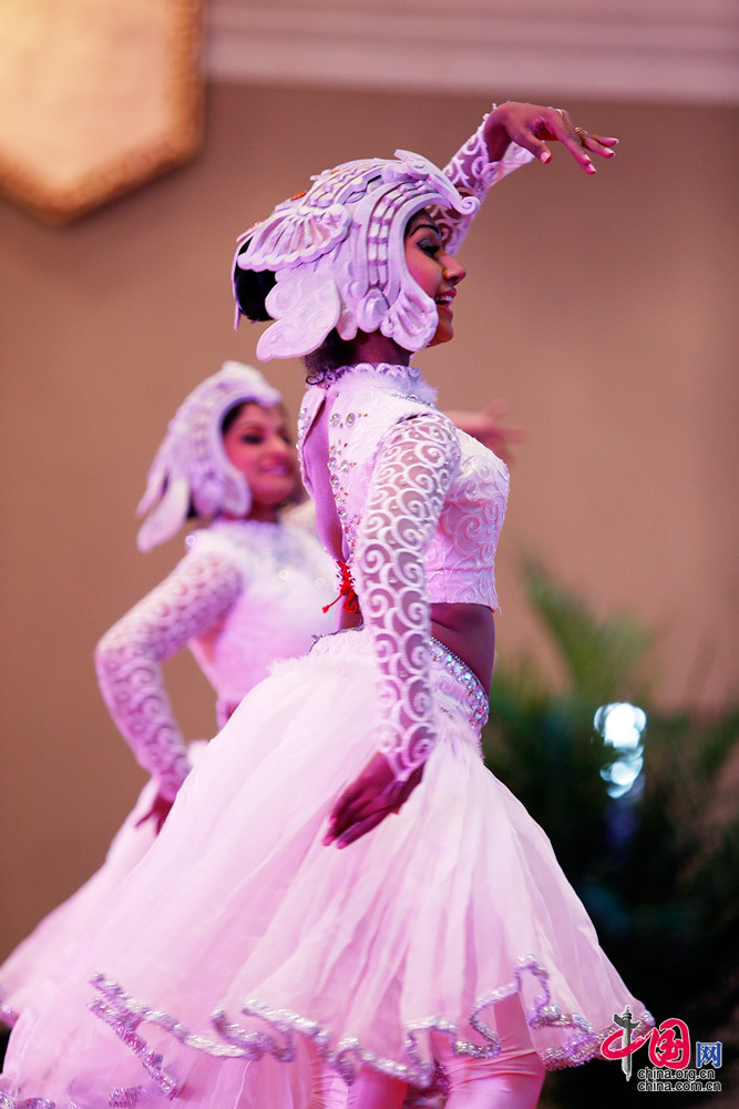 在庆祝的活动中,来自斯里兰卡和中国的艺术家带来了精彩的文艺演出。富有两国民族特色的歌舞表演,赢得现场阵阵掌声。图为斯里兰卡艺术家的歌舞表演。中国网 杨佳 摄影
