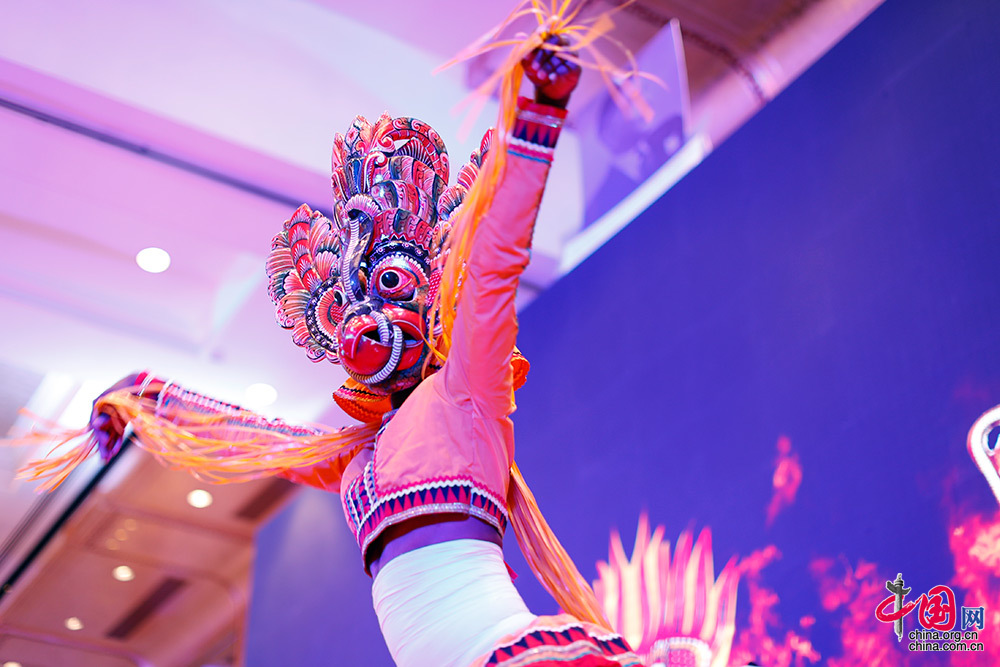 在庆祝的活动中,来自斯里兰卡和中国的艺术家带来了精彩的文艺演出。富有两国民族特色的歌舞表演,赢得现场阵阵掌声。图为斯里兰卡艺术家的舞蹈表演。 中国网 杨佳 摄影