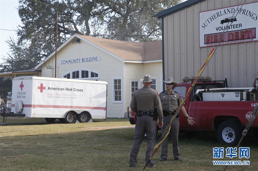 11月6日,在美国得克萨斯州萨瑟兰斯普林斯,警方在枪击事件发生地附近执勤。美国得克萨斯州公共安全官员6日说,得州萨瑟兰斯普林斯教堂枪击事件的伤者中仍有10人未脱离生命危险,医护人员正在全力救治。枪击事件死亡人数可能还会上升。当地时间5日上午11时20分许,身着防弹背心、头戴黑色面罩的枪手在萨瑟兰斯普林斯一教堂外和教堂内开枪扫射,造成至少26人死亡,约20人受伤。警方随后发现枪手死在自己的车内。新华社记者李颖摄