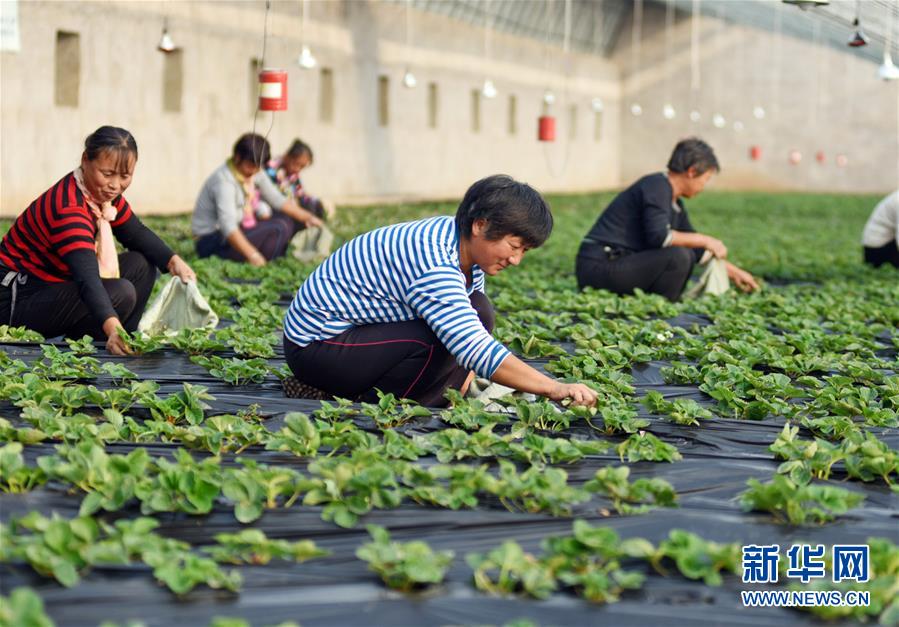 11月7日,河北省衡水市桃城区北沼村农民在草莓温棚内劳作。当日是二十四节气中的立冬,各地农民抢抓农时做好采收、播种、御寒管理等工作,田间地头一派繁忙。新华社记者 朱旭东 摄