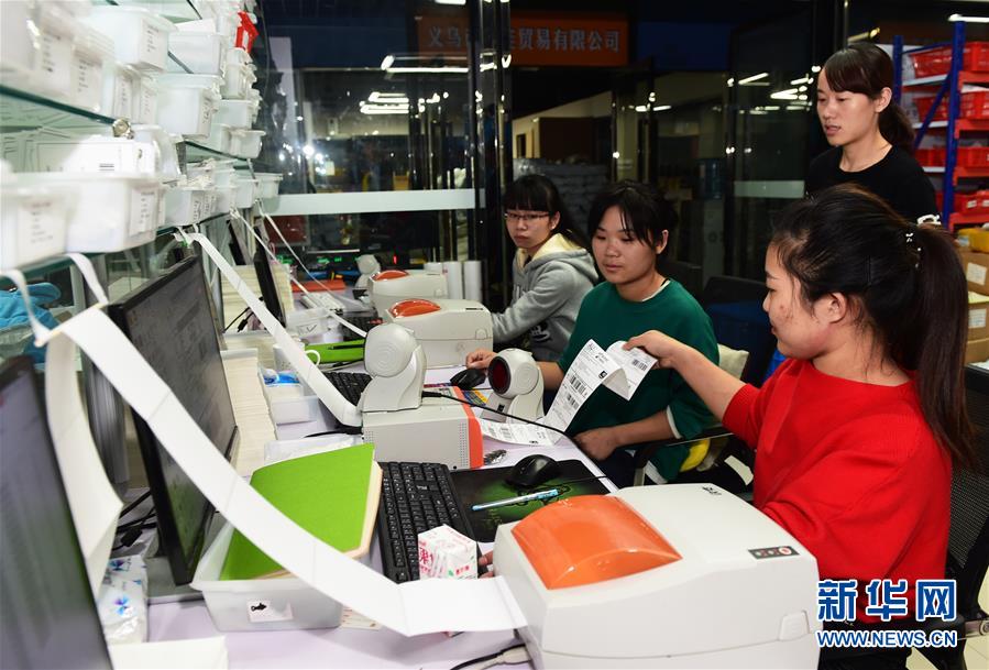 11月8日,在义乌国际商贸城,商家工作人员打印快递单。“双十一”临近,浙江义乌国际商贸城的工作人员忙着接单、打包,为即将到来的网购热潮积极备战。新华社发(龚献明 摄)