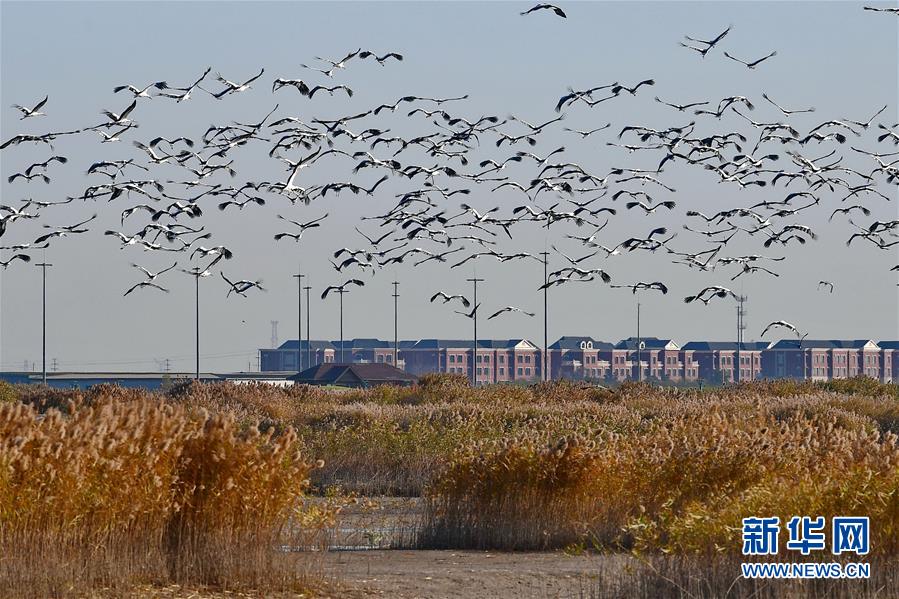 11月10日,东方白鹳在曹妃甸湿地飞舞。