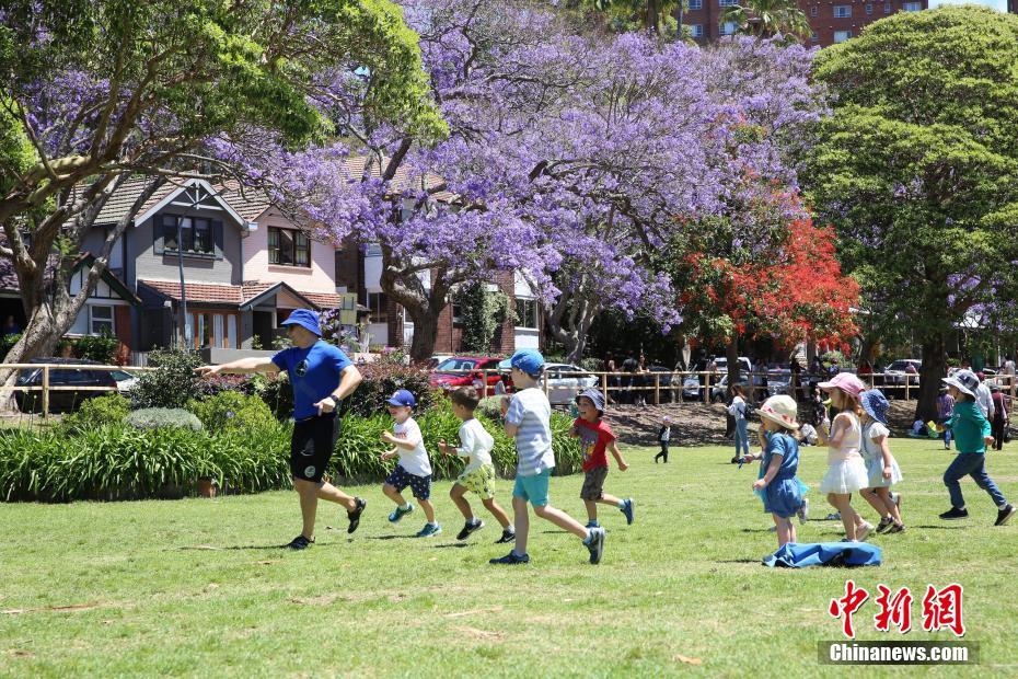孩子们在蓝花楹树下追逐嬉戏。 中新社记者 陶社兰 摄