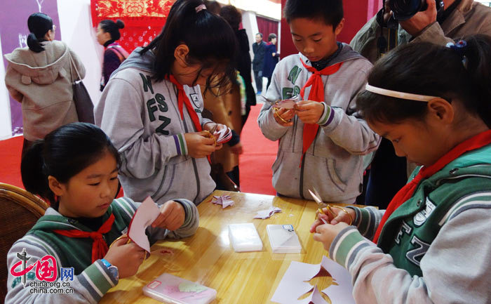 宿迁的小学生们在展览现场学习剪纸。