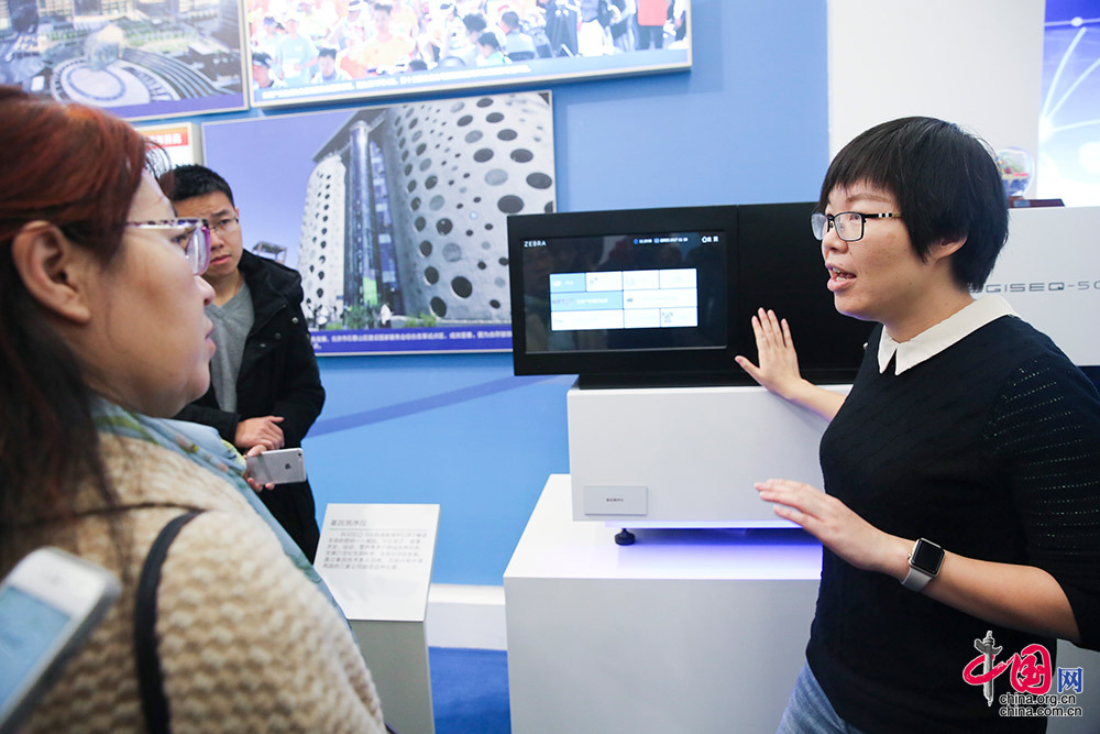 深圳华大智造科技有限公司副总裁、深圳华大基因研究院副院长蒋慧现场向记者介绍BGISEQ-500基因测序系统。中国网 董宁 摄