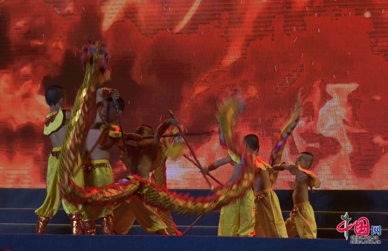 晚会上,一群孩子表演舞龙。