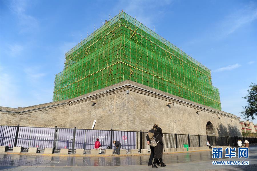 11月23日,游客从进行保护性维修的西安鼓楼前走过。近日,西安鼓楼开始进行保护性维修。据了解,此次维修将持续至12月24日,在此期间鼓楼暂停开放。西安鼓楼始建于明代,距今已有600余年历史。新华社发(张博文摄)
