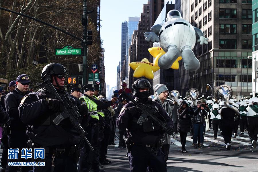 当日,美国纽约举行梅西感恩节大游行,警方加强警戒,确保游行安全。