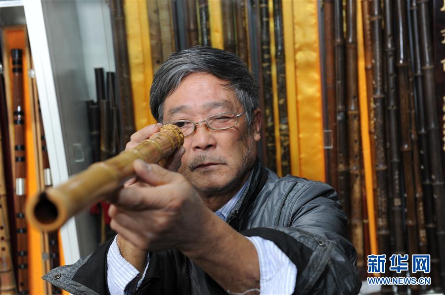 11月24日,在玉屏侗族自治县箫笛生产基地,侗族箫笛制作专家刘泽松在查看一支箫笛的内部构造。近年来,为保护传承玉屏箫笛文化,推动箫笛文化产业发展,贵州省玉屏侗族自治县先后建设箫笛博物馆、箫笛生产基地等,并对箫笛制作、曲目创作、竹材种植等项目进行扶持和奖励,培养和引进箫笛演奏专业人才。据悉,到2016年底,玉屏侗族自治县的箫笛年产值达到2500万元,从业人员达150多人。新华社记者杨楹 摄