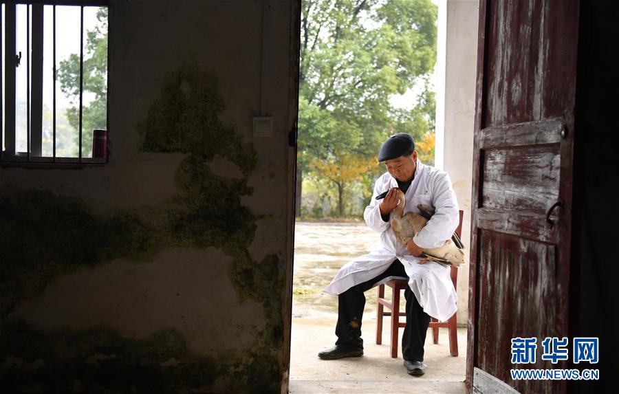 11月28日,李春如在安抚一只受伤的鸿雁。新华社记者胡晨欢摄