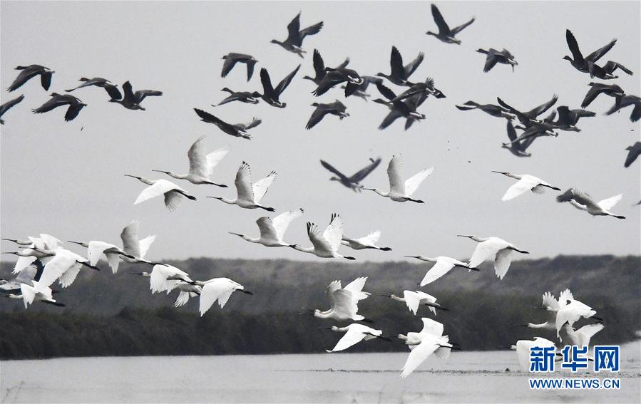 11月29日,候鸟在江西鄱阳湖南矶湿地国家级自然保护区飞翔。 近日,大批南迁候鸟飞抵鄱阳湖栖息越冬。 新华社记者 万象 摄