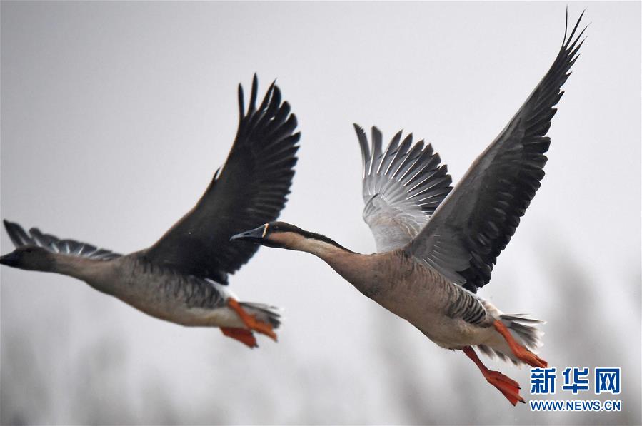 11月29日,候鸟在江西鄱阳湖南矶湿地国家级自然保护区飞翔。 近日,大批南迁候鸟飞抵鄱阳湖栖息越冬。 新华社记者 万象 摄