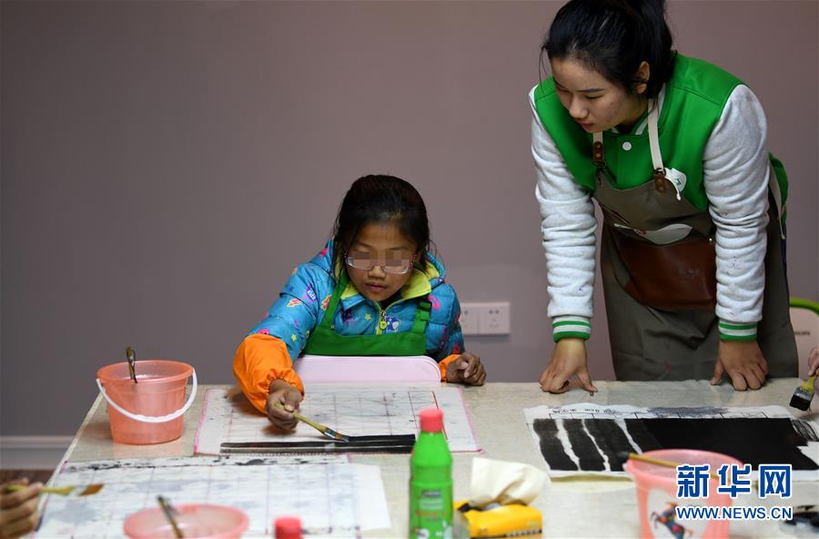 珍珍(左)在培训机构学习画画(11月26日摄)。