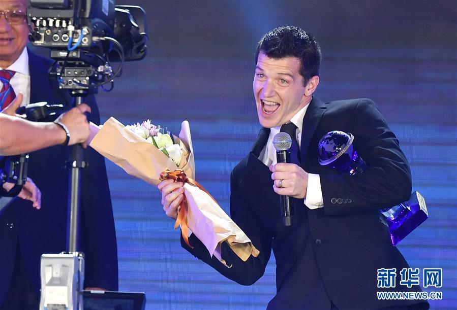 12月2日,美国选手史蒂文·洛布领取年度高台跳水最佳男运动员奖。当日,2017国际泳联年度颁奖盛典在三亚举行,颁发了年度跳水最佳运动员奖、年度游泳最佳运动员奖等奖项。新华社记者 郭程 摄