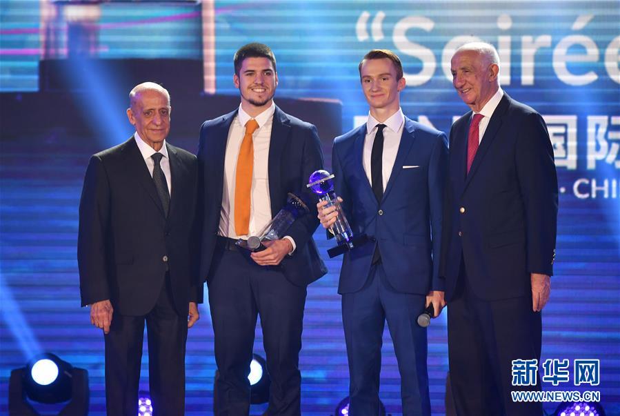 12月2日,俄罗斯选手亚历山大·马尔采夫(右二)和意大利选手乔治·米尼吉尼(左二)领取年度花样游泳最佳男运动员奖。当日,2017国际泳联年度颁奖盛典在三亚举行,颁发了年度跳水最佳运动员奖、年度游泳最佳运动员奖等奖项。新华社记者 郭程 摄