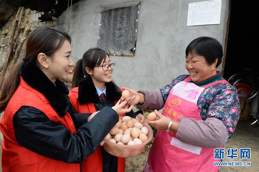 12月4日,在贵州省绥阳县郑场镇狮山村,绥阳县国家税务局包村帮扶干部在贫困户黄小敏家回收鸡蛋和出栏鸡。