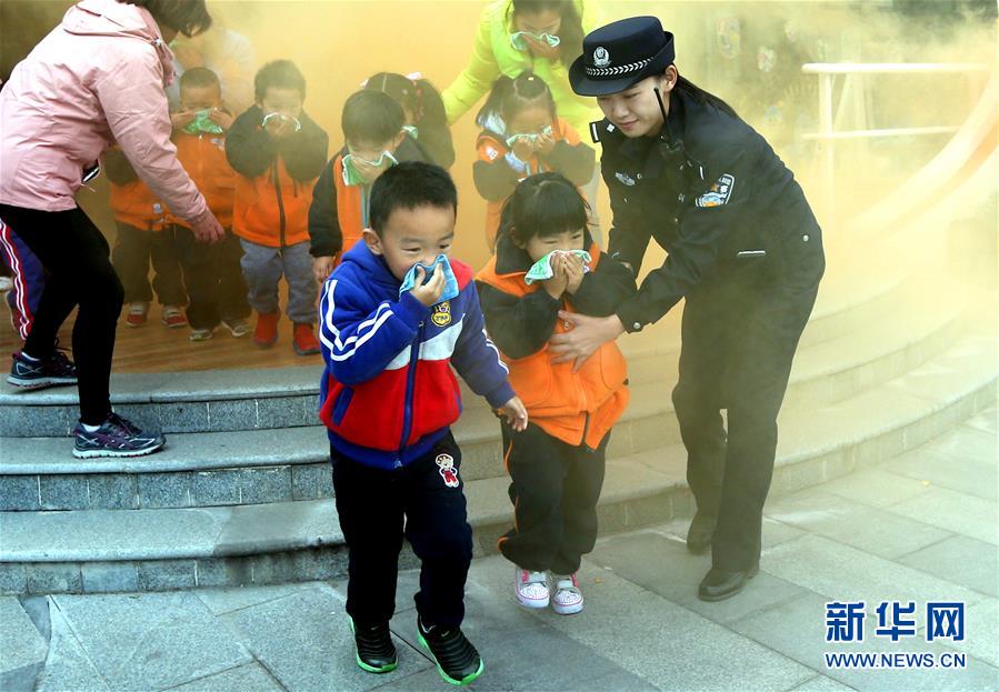 12月4日,上海闵行区尚义幼儿园的小朋友在民警和老师的带领下从“着火”的大楼紧急疏散。
