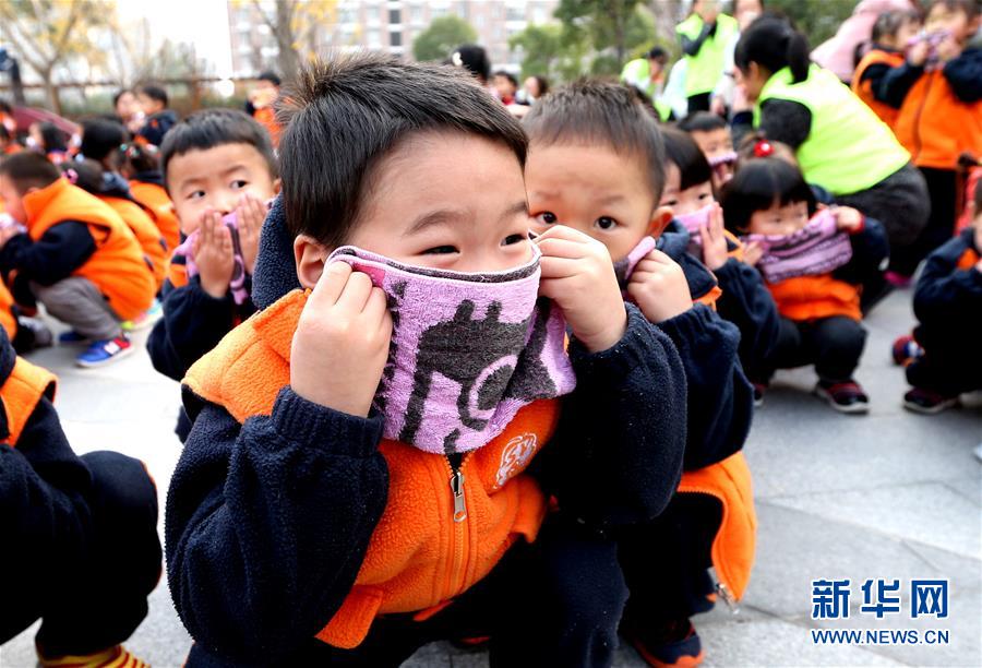 12月4日,上海闵行区尚义幼儿园的小朋友从“着火”的大楼紧急疏散到操场上。