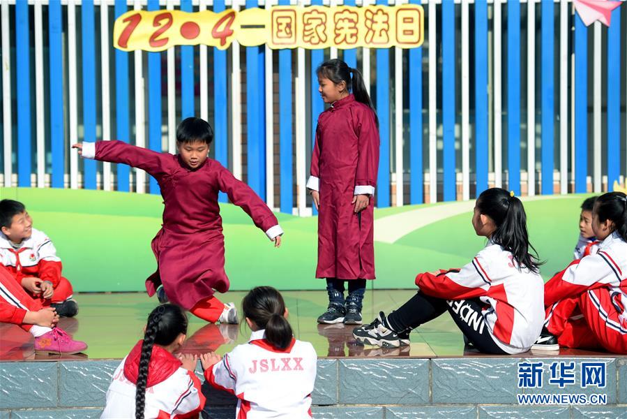 12月4日,在石家庄市建胜路小学,学生们在表演以法律知识为主题的相声节目。