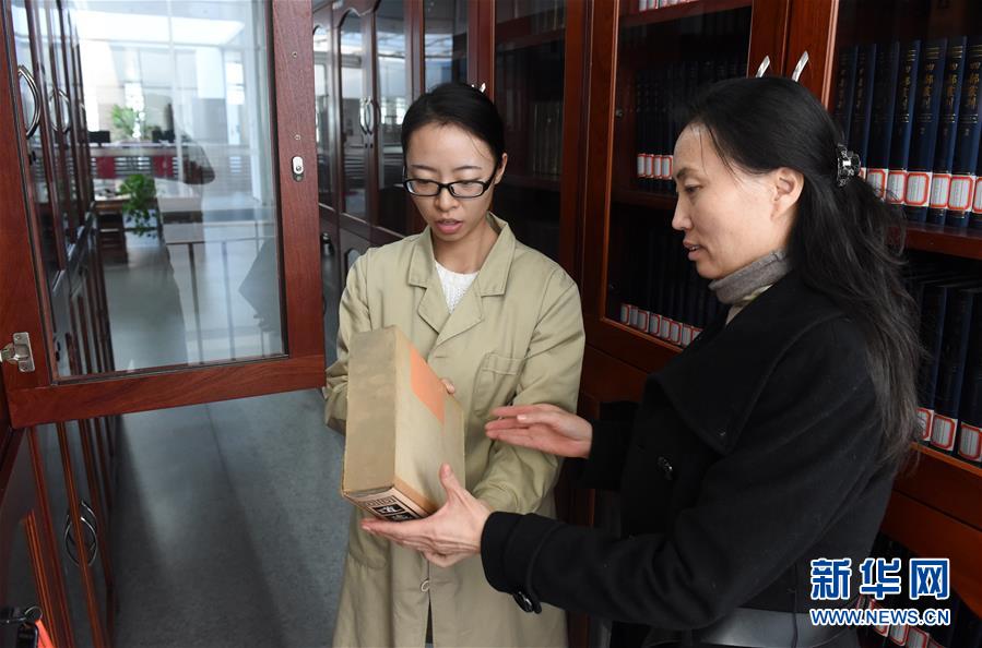 在河北省图书馆古籍阅览室,特藏部工作人员孙晓旭(左)为读者魏胜敏拿取书籍(11月22日摄)。孙晓旭表示,作为一名古籍工作者,要按照十九大精神做好本职工作,将古籍保护好、开发利用好。