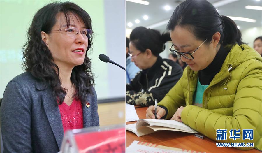 拼版照片:苏文珠(左)在秦皇岛市图书馆宣讲十九大精神(11月23日摄)。